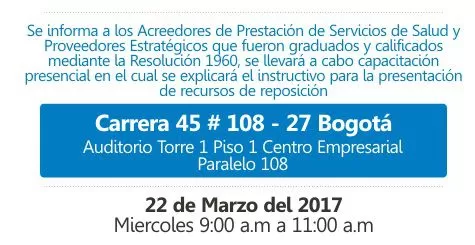 CONSULTORSALUD se permite amplificar a los Acreedores de Prestación de Servicios de Salud y Proveedores Estratégicos de SALUDCOOP EN LIQUIDACION, que fueron graduados y calificados mediante la Resolución 1960 del 6 marzo de 2017, que el proximo miercoles 22 de marzo del presente año, de 9:00 a.m. a 11:00 a.m., se llevará a cabo capacitación presencial en el Auditorio de la Torre 1, piso 1 ubicado en la carrera 45 No. 108 – 27, del Centro Empresarial Paralelo 108 de la Ciudad de Bogotá, en la cual se explicará el instructivo para la presentación de recursos de reposición, se resolverán dudas y solicitudes sobre la calificación y graduación de acreencias.
